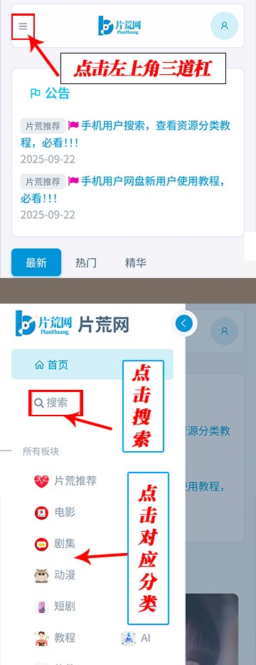 手机版查看资源,使用搜索功能教程。点击页面顶部左侧的三道杠,即可看到搜索框和资源分类。