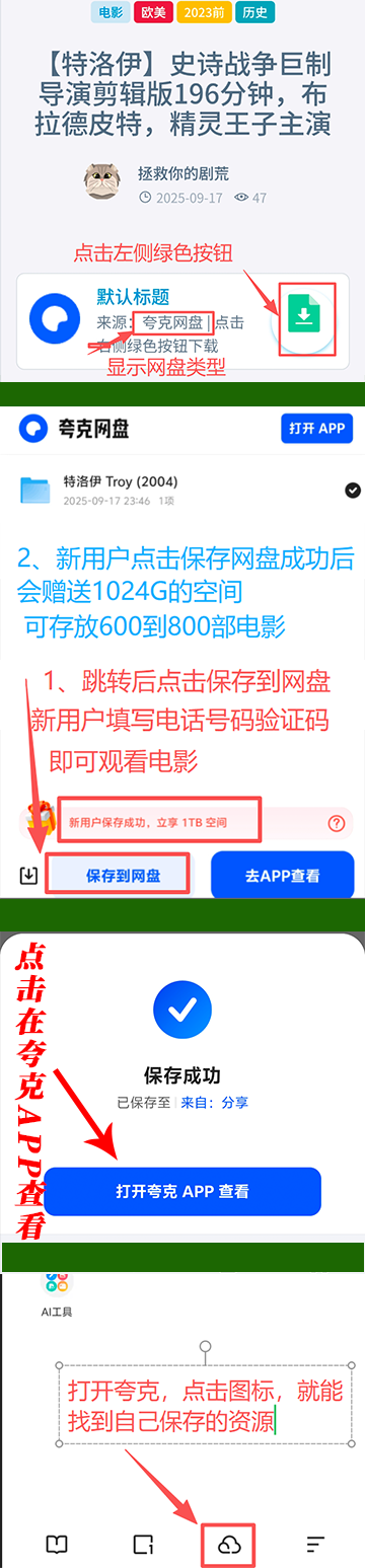 手机用户夸克网盘使用教程,必看!!! 目录1. 之前没有使用过网盘的用户,推荐使用夸克网盘。2. 点击绿色按钮,会跳转到网盘页面,点击左下角【保存到网盘】,如果是新用户,填写电话号码,输入验证码后,即可观看。3. 夸克网盘新用户保存资源成功,会赠送1000G的空间,可以存储600-800部电影,看都看不完。1. 注册完后,在应用商店搜索夸克,安装后观看更方便。 之前没有使用过网盘的用户,推荐使用夸克网盘。 点击绿色按钮,会跳转到网盘页面,点击左下角【保存到网盘】,如果是新用户,填写电话号码,输入验证码后,即可观看。 夸克网盘新用户保存资源成功,会赠送1000G的空间,可以存储600-800部电影,看都看不完。 注册完后,在应用商店搜索夸克,安装后观看更方便。
